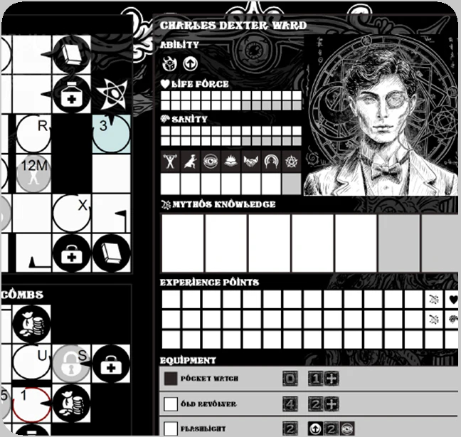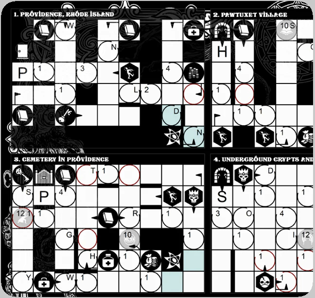 GRIMLORE Profane Truths is an episodical print-and-play word-finding and dice-manipulation game with role-playing aspects. In every episode (or case file), you try to fill several scenarios with letters to form dictionary words to progress in the story and to defeat your opponents. As you progress, the character that you represent gains more knowledge and equipment to help them in their case.